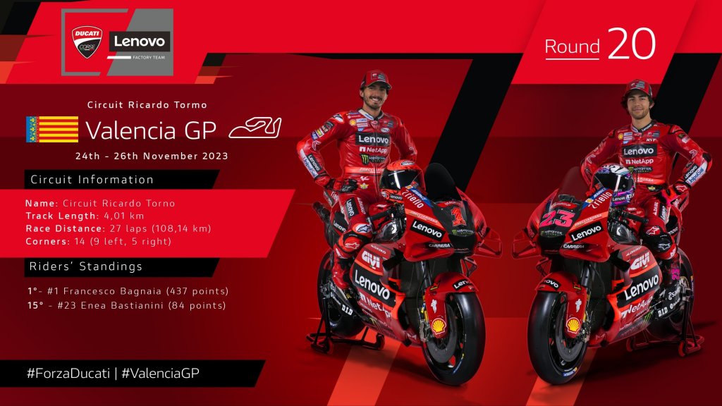 I piloti del Ducati Lenovo Team scenderanno in pista per la prima sessione di prove venerdì 24 novembre alle ore 10:45. La gara Sprint (13 giri) e il GP della Comunità Valenciana (27 giri) si correranno invece rispettivamente sabato 25 e domenica 26 novembre alle ore 15:00 locali.