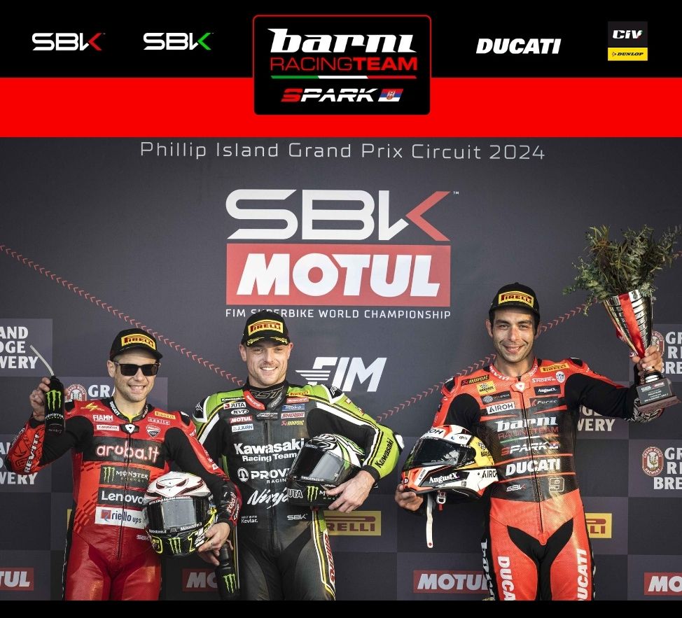 Weekend da incorniciare per il Barni Spark Racing Team che torna dalla trasferta in Australia con due vittorie di Montella in Supersport e un terzo posto acciuffato all’ultimo giro di gara 2 da Petrucci in Superbike.
