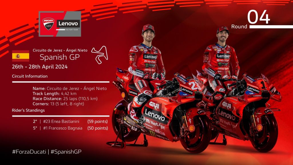 Il Circuit de Jerez – Ángel Nieto ospiterà per la trentanovesima volta il Mondiale quest’anno. Finora Ducati ha ottenuto 10 podi sulla pista andalusa ed è riuscita a trionfare in 4 occasioni. Prima del 2021, il tracciato era reputato uno dei più ostili alla casa di Borgo Panigale, che era riuscita ad ottenere un unico successo solo nel 2006 con Loris Capirossi. Nelle ultime tre edizioni del Gran Premio, il Ducati Lenovo Team si è rivelato invece essere protagonista assoluto: nel 2021 ha centrato una straordinaria doppietta con Jack Miller, vincitore davanti al compagno di squadra Francesco Bagnaia, quest’ultimo autore invece di due spettacolari vittorie sia nel 2022 che nel 2023.