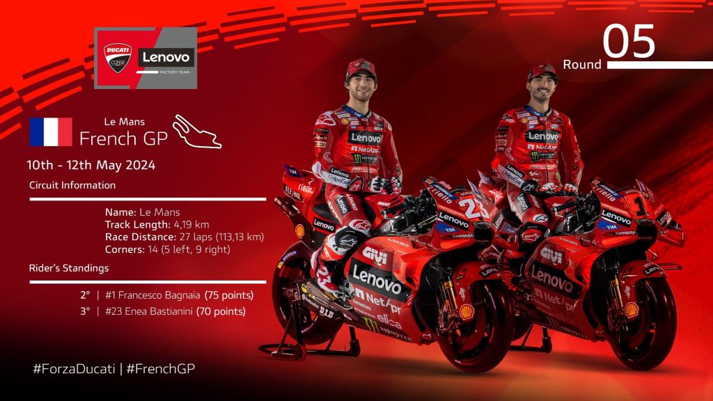 Il quinto appuntamento della stagione MotoGP 2024 si correrà in Francia sullo storico circuito di Le Mans, situato nella regione della Sarthe. Delle 36 edizioni finora disputate del GP di Francia (quest’anno sarà la trentasettesima), Ducati ha trionfato nelle ultime quattro edizioni: nel 2020 con Danilo Petrucci, nel 2021 con Jack Miller, nel 2022 con Enea Bastianini e nel 2023 con Marco Bezzecchi.