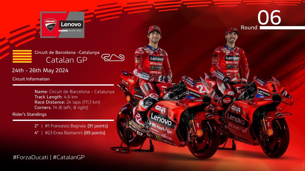Il Ducati Lenovo Team torna in Spagna questo fine settimana per affrontare il GP Monster Energy di Catalogna, sesto appuntamento della stagione MotoGP 2024.