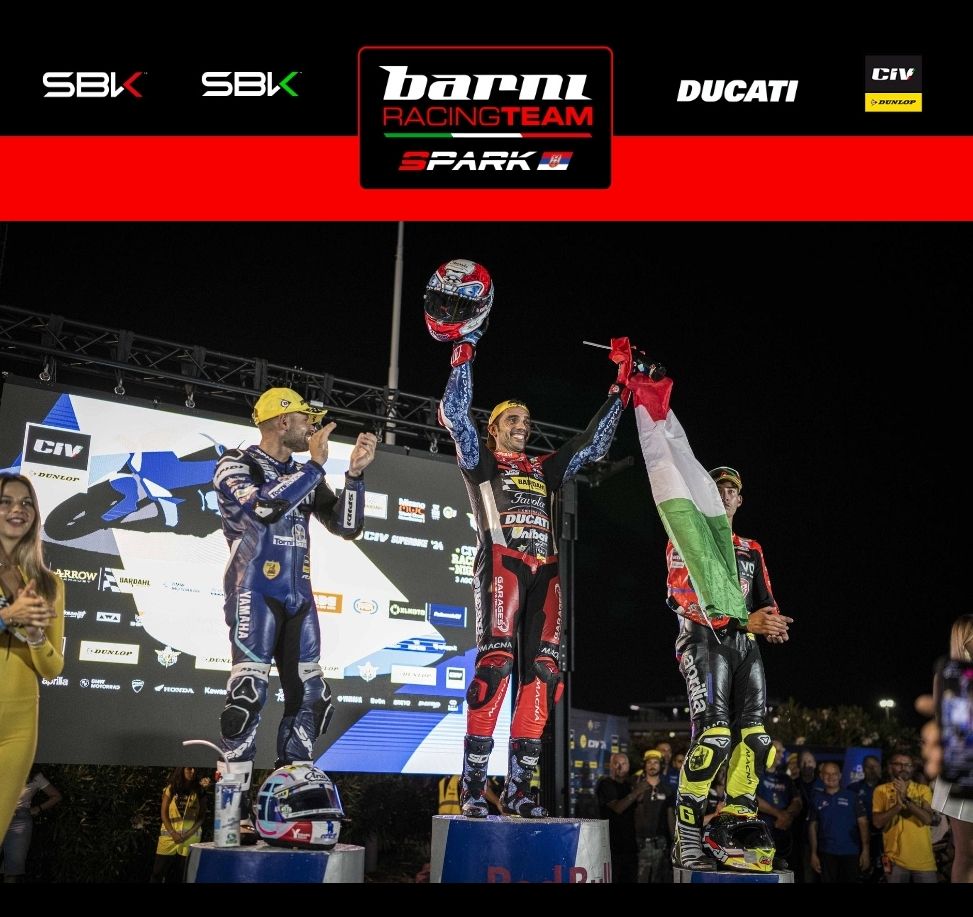 Si conclude nel modo migliore per il Barni Spark Racing Team il sabato della Bardahl Racing Night sul circuito di Misano Adriatico. Per la quarta volta in altrettante edizioni della gara coi fari sulle moto a vincere nella classe Superbike è Michele Pirro, dopo una bellissima battaglia con Alessandro Delbianco fino all’ultimo giro. Partito dalla pole position conquistata al mattino, Pirro si è subito messo a tirare e solo Delbianco è riuscito a restare in scia, con un distacco sempre inferiore al mezzo secondo. I due hanno salutato tutti gli altri e a due giri dalla fine il pilota della Yamaha ha provato l’attacco prendendosi la prima posizione, ma nell’ultimo passaggio Pirro ha risposto tagliando il traguardo per primo. Per il #51 è la sesta vittoria in sette gare stagionali e ora il suo vantaggio sul secondo in campionato è di 39 punti.