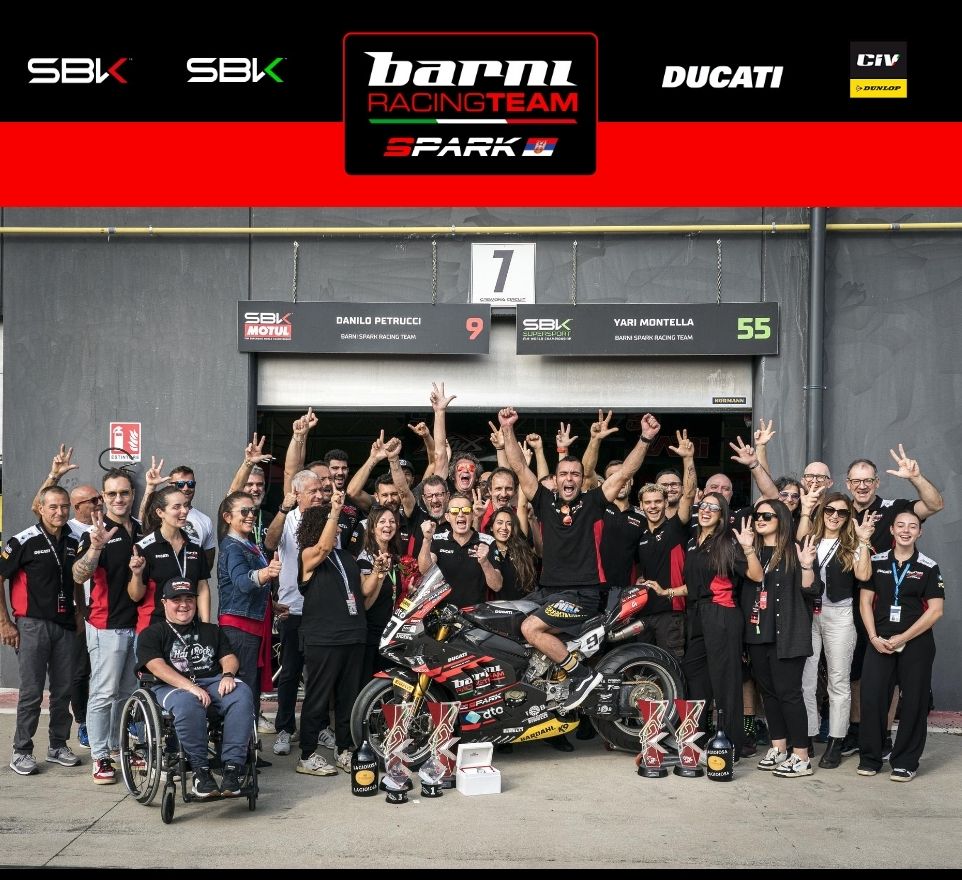 Una pagina di storia del team, una pagina di storia del Mondiale Superbike. Ieri Danilo è diventato il primo pilota al mondo a vincere in MotoGP, Dakar, MotoAmerica e Mondiale Superbike. Oggi il Barni Spark Racing Team è diventato il primo team indipendente a vincere tre gare in un weekend! Già, perchè Petrux – dopo la vittoria del sabato – si è ripetuto nelle due gare della domenica, conquistando una fantastica tripletta. Lo ha fatto nella vera gara di casa del team, davanti a tantissimi sponsor e amici del team Barni che sono arrivati qui per il fine settimana.