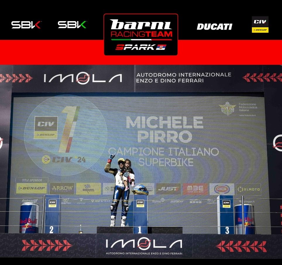 Nel round conclusivo del CIV, a Imola, il Barni Spark Racing Team termina gara 1 con un podio grazie al secondo posto di Michele Pirro, in pista con una livrea celebrativa del suo decimo titolo italiano, il settimo in SBK, conquistato con due gare di anticipo. La giornata era iniziata sotto i migliori auspici: nella seconda e decisiva sessione di qualifica, il pilota delle Fiamme Oro ha conquistato la pole position (1’48.397), guadagnandosi il diritto di partire davanti a tutti.