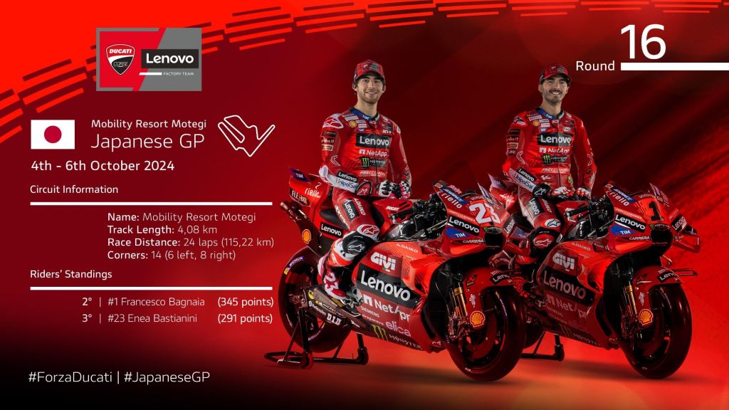 Dopo il GP dell’Emilia-Romagna e il GP dell’Indonesia, il Ducati Lenovo Team arriva in Giappone per disputare il terzo appuntamento della penultima tripla per la stagione MotoGP 2024. Ad ospitare l’evento sarà come sempre il celebre tracciato di Motegi che in passato ha già ospitato il Mondiale in 23 occasioni.