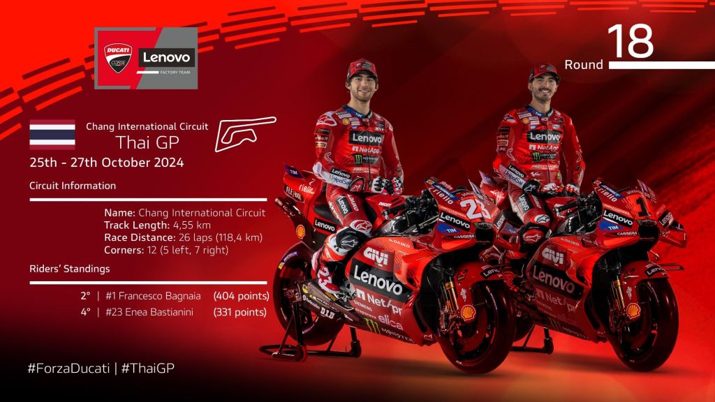 Il Ducati Lenovo Team, che attualmente occupa la prima posizione nella classifica riservata alle squadre, avrà possibilità di vincere il titolo mondiale a Buriram.