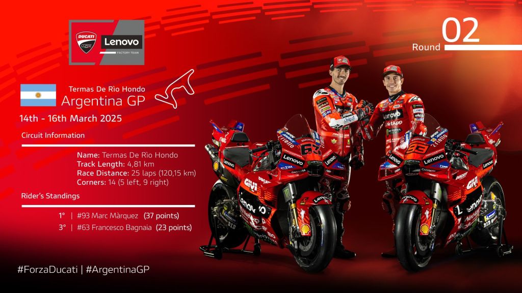 Archiviato il GP di Tailandia con la prima vittoria della stagione, un doppio podio e la testa di tutte le classifiche, i piloti del Ducati Lenovo Team tornano al lavoro per la seconda gara della stagione in Argentina. Teatro di una sola vittoria targata Ducati (Bezzecchi, 2023), Termas di Rio Hondo torna ad accogliere il circus della MotoGP a distanza di due anni (ultimo GP 2023 – podio completo Ducati).