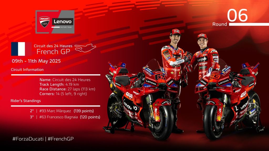 “Nonostante meteo e temperature, Le Mans è una pista che mi piace da sempre e che ben si adatta alla Ducati. A Jerez sono stato solido nella Sprint, in gara mi sono mancati i sorpassi, ma abbiamo raccolto una doppia P3 e tanti punti. Nel test poi ho fatto dei passi in avanti, provato alcune soluzioni che riporteremo anche qui e che possono farci essere più competitivi”.
