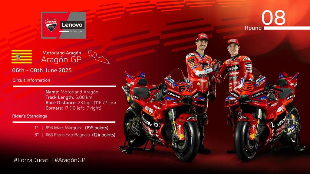 La splendida cornice del MotorLand di Aragón accoglie il circus della MotoGP per l’ottavo GP della stagione 2025. Un tracciato con ben 10 curve a sinistra che ha visto trionfare la Desmosedici GP per ben 4 volte e nelle ultime 3 edizioni. Nel 2010 vinse Stoner ed esattamente 11 anni più tardi (2021), Francesco Bagnaia ha centrato qui la sua prima vittoria in MotoGP con il Ducati Lenovo Team. Nel 2022 sigillo di Bastianini e lo scorso anno dominio di Marc Márquez in entrambe le gare; Marc che proprio ad Aragón ha trionfato per ben 6 volte nella Premier Class.