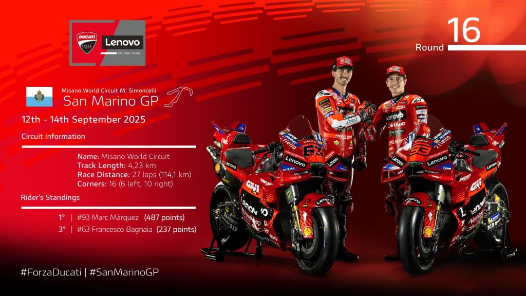 Settembre intenso per il Ducati Lenovo Team che da Barcellona vola a Misano Adriatico per il 16esimo Round della stagione 2025. Titolo costruttori in tasca, il settimo della storia e il sesto consecutivo, Ducati arriva al Misano World Circuit Marco Simoncelli, dove si corre dal 2007. Una pista dove la Desmosedici GP ha conquistando 7 vittorie e lo scorso anno ha centrato proprio qui l’importante traguardo dei 100 trionfi nella Premier Class. Completano l’albo d’oro di Borgo Panigale in Romagna i sigilli di Stoner (2007), Dovizioso (2018), la doppietta di Bagnaia (2022 e 2023), Martin (2023), Bastianini (Emilia Romagna GP) e Marc Márquez (entrambi lo scorso anno).