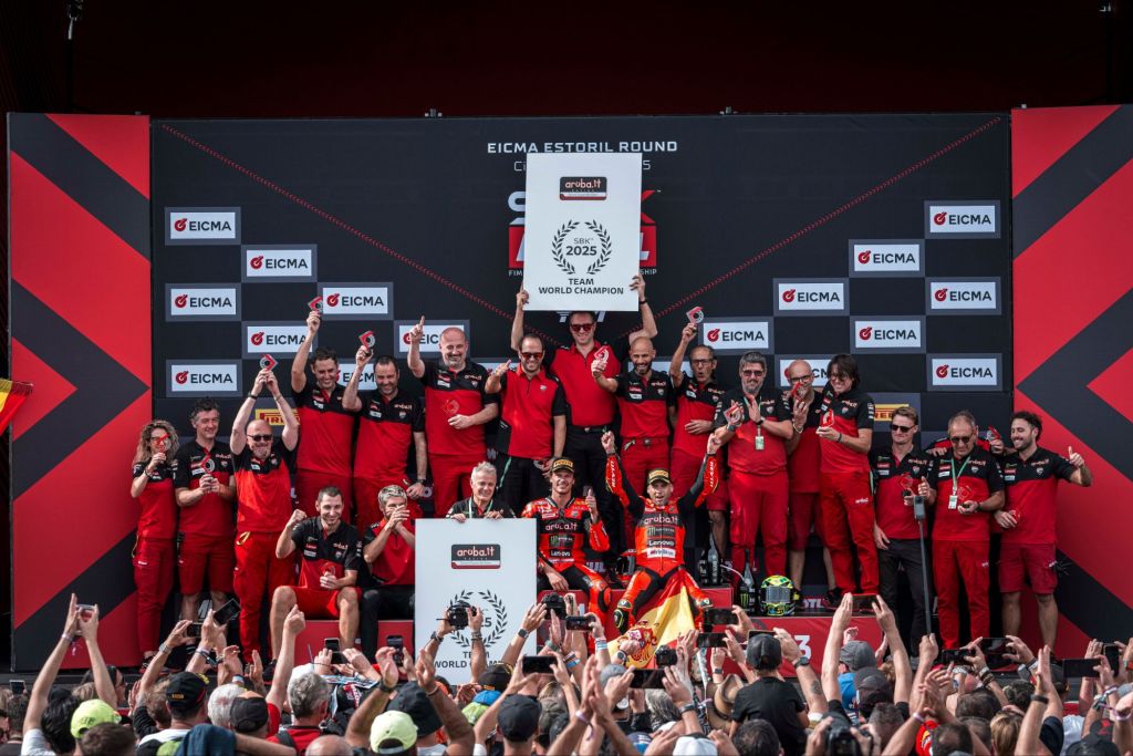 Dopo il secondo e terzo posto di Nicolò Bulega e Álvaro Bautista in Superpole Race, Gara 2 dell’Eicma Estoril Round si conclude con una vittoria limpida del pilota italiano e il terzo posto del compagno di squadra. E dopo le celebrazioni del podio è il team a festeggiare per il quarto anno consecutivo il titolo di Campione del Mondo riservato alle squadre.
