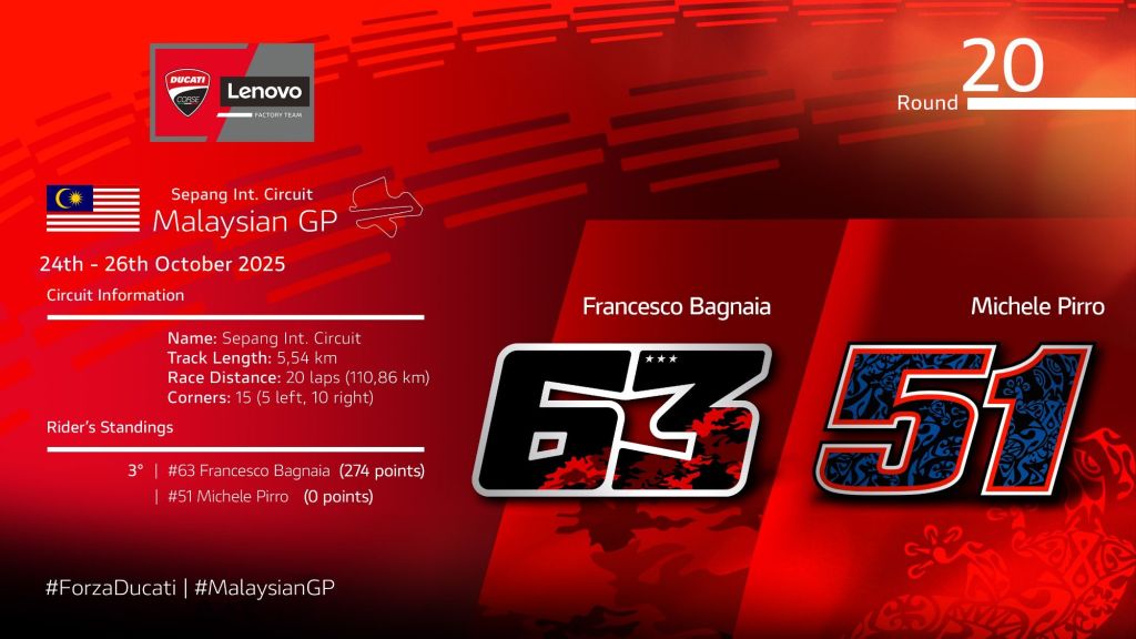 Ultima tappa extra europea della stagione 2025 per il Ducati Lenovo Team che arriva al Sepang International Circuit di nuovo con la coppia Bagnaia – Pirro. Come comunicato, Marc Márquez, Campione del Mondo attualmente in carica, continua il recupero post intervento chirurgico e non sarà presente all’evento.