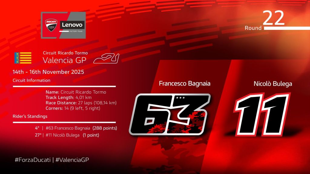 Ultimo atto di un anno da incorniciare per il Ducati Lenovo Team con il triple crown. A Valencia si torna a correre a un anno dall’alluvione che ha colpito la zona, chiudendo così la stagione 2025 della MotoGP. Tempo di bilanci e primi test alle porte Circuit Ricardo Tormo, tracciato che ha visto trionfare Ducati per ben 5 volte. Prima vittoria, leggendaria, nel 2006 con Troy Bayliss, dominatore assoluto e Loris Capirossi secondo. Una giornata che rimarrà per sempre negli annali del Motociclismo e nella storia di Borgo Panigale. Poi Casey Stoner nel 2008, Andrea Dovizioso nel 2018 e Francesco Bagnaia, che proprio a Valencia ha festeggiato entrambe le vittorie iridate, nel 2021 e 2023.