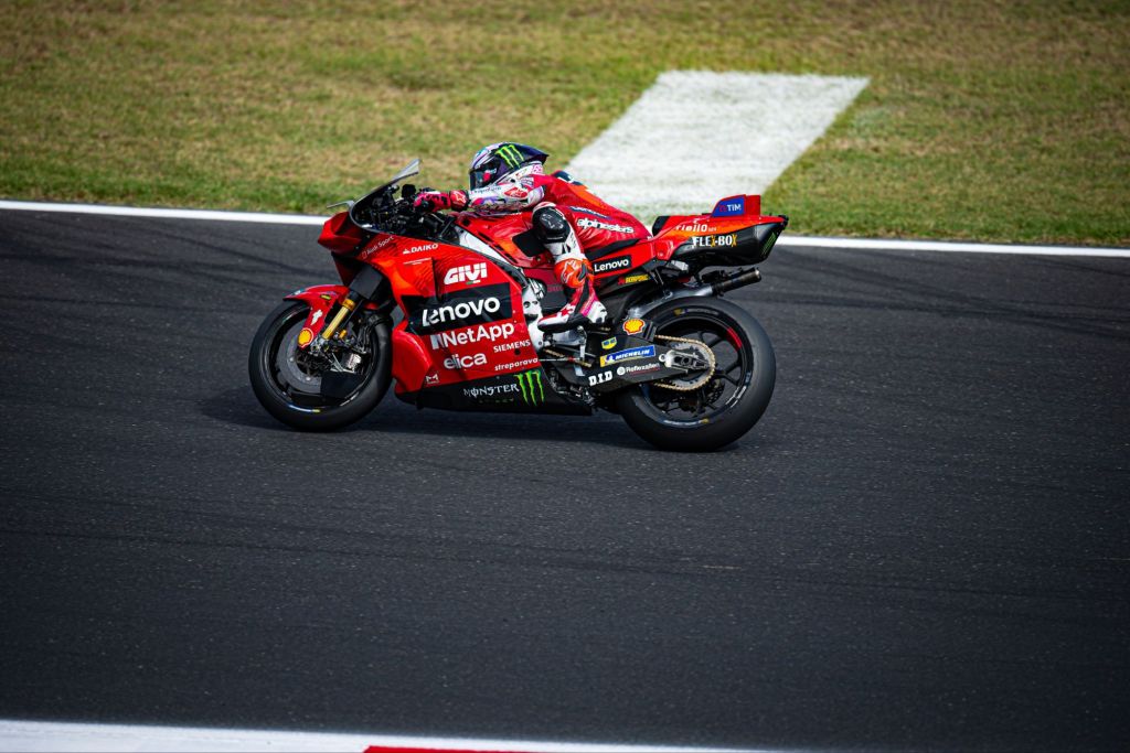 Bagnaia è stato autore di una buona partenza dalla pole position, che gli ha permesso di conquistare la testa della corsa nel cambio di direzione dopo la prima curva. Il campione del mondo in carica, nonostante il buon passo, è apparso in difficoltà a livello di aderenza con il posteriore della moto, subendo prima il sorpasso da Martín al quarto giro e poi dal compagno di squadra nel passaggio seguente. Dopo aver perso terreno dai rivali, Pecco ha provato il cambio di passo, facendo segnare due giri più veloci di gara in sequenza, ma una scivolata a sette tornate dal termine lo ha privato di un podio che era alla sua portata.