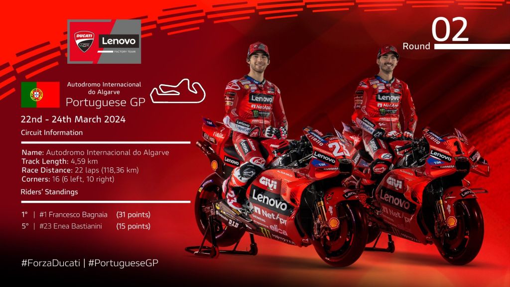 Forte dei due podi consecutivi ottenuti in Portogallo e negli Stati Uniti, Enea Bastianiani arriva in Spagna determinato a lottare nuovamente per le prime posizioni e poter così sommare altri punti importanti per la classifica generale che lo vede attualmente secondo a 21 lunghezze dal leader e compagno di marca Jorge Martín (Pramac Racing). Francesco Bagnaia, quinto attualmente nel Mondiale con 50 punti, torna invece in pista con l’obiettivo di tornare a lottare per la vittoria su una pista che lo ha visto sempre tra i protagonisti in passato.