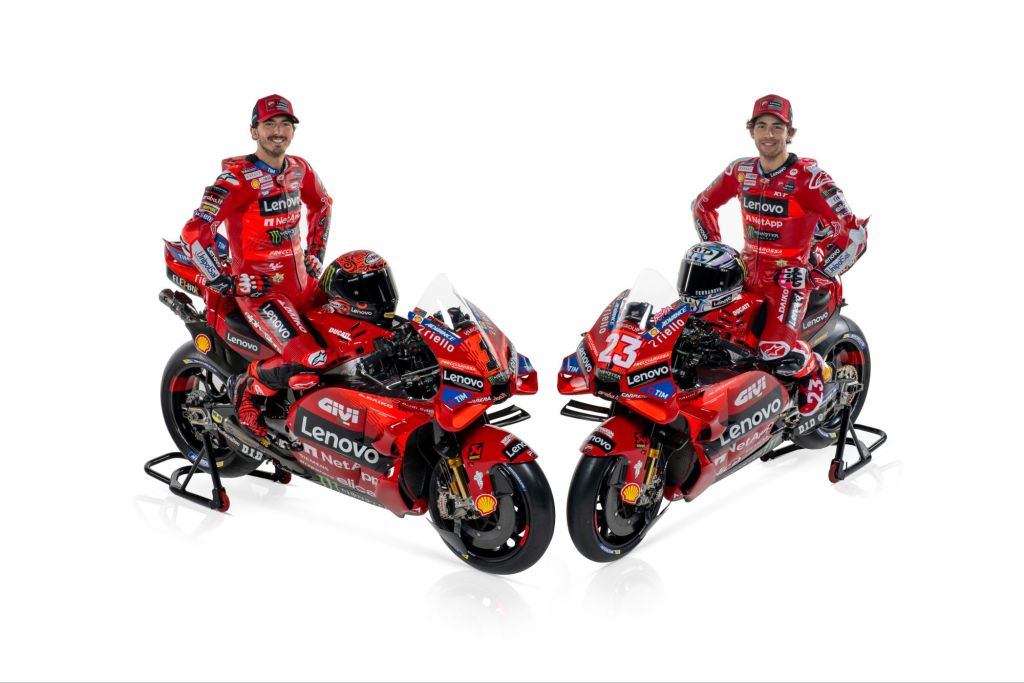 La livrea, come sempre predominata dal colore Rosso Ducati, è stata impreziosita da un dettaglio grafico fluo che riprende la curva presente nel logo Ducati e che si ripresenta anche sulle carene della Panigale V4 R Superbike del team Aruba.it Racing – Ducati e sulle nuovissime moto da cross del Ducati Corse R&D – Factory MX Team, svelate sul palco insieme alle MotoGP. Il Campione del Mondo in carica Francesco “Pecco” Bagnaia è pronto a difendere il titolo ed il numero 1 sul cupolino della sua Desmosedici GP. Bagnaia sarà ancora una volta affiancato dal connazionale Enea Bastianini, al suo secondo anno insieme alla squadra ufficiale, mentre in Superbike, accanto alla Panigale V4 R con il numero 1 di Alvaro Bautista ci sarà la Ducati con il numero 11 del Campione del Mondo in carica Supersport Nicolò Bulega, al suo debutto nella categoria.