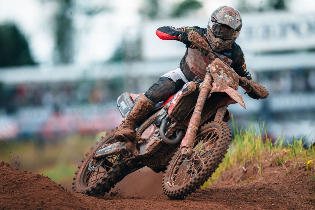 Forti del 10° e del 12° posto conquistati al sabato, Jeremy Seewer e Mattia Guadagnini si sono schierati al via di gara uno con una pista molto segnata dalle abbondanti precipitazioni, cadute nella notte sull’area del circuito. Buono lo scatto dal cancello di Seewer che non riesce però a trovare un varco per curvare con i primi e rimane imbottigliato nel traffico della prima curva, ritrovandosi fuori dai quindici, mentre Guadagnini riesce a sfruttare meglio la potenza della sua Desmo450 MX, passando sulla linea dell’hole-shot a ridosso della top 10, perdendo però qualche posizione nel corso del primo giro che chiude 13°, mentre il compagno di squadra è 15°. Al termine di 17 giri di una manche particolarmente impegnativa, Mattia passa sul traguardo 14°, con Jeremy poco distante in sedicesima posizione, rallentato da un problema tecnico. L’avvio di gara due è più promettente con l’italiano 10° davanti all’elvetico; nel corso del decimo giro Seewer passa il compagno di squadra ed entra nella top 10, posizione che tiene fino a un giro e mezzo dal termine, quando una caduta lo fa precipitare al 18° posto sotto la bandiera a scacchi, con Guadagnini che lo precede sul traguardo al 12°. In campionato lo svizzero è ancora nella top 10, mentre il veneto recupera punti sui piloti che lo precedono in classifica.