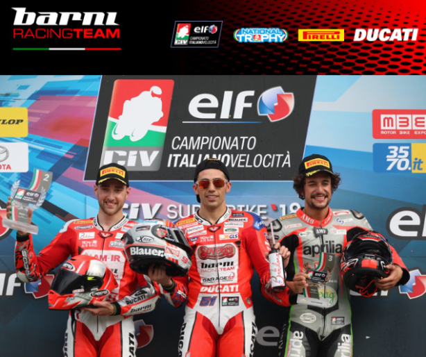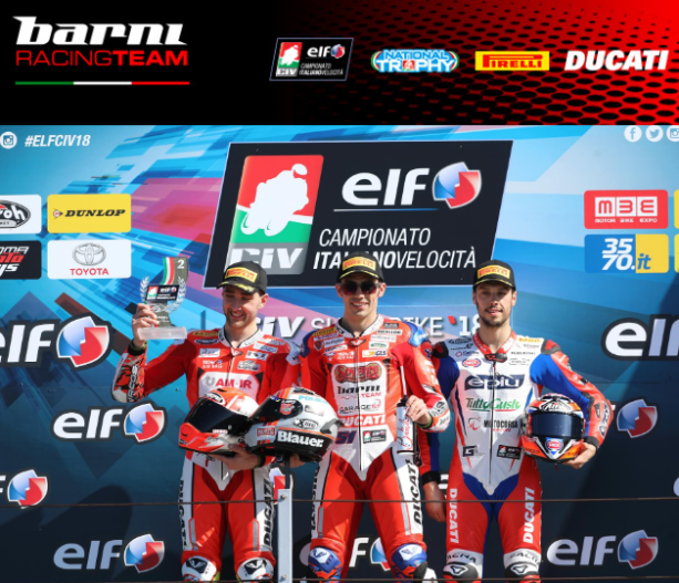 Il pomeriggio ha riservato un’altra grande soddisfazione alla squadra di Marco Barnabò. Il Barni Racing è il primo team a portare la Ducati Panigale V4 sul podio in gara. Dopo sole due gare Luca Conforti ha conquistato una splendida seconda posizione nel National Trophy 1000 entrando così nella storia della casa di Borgo Panigale come primo pilota ad aver portato nella top 3 una Ducati quattro cilindri. Per vedere la “V4” in configurazione Superbike bisognerà attendere il 2019, ma la nuova “rossa” cresce alla grande nelle mani del team bergamasco e fa già intravedere tutto il suo potenziale.