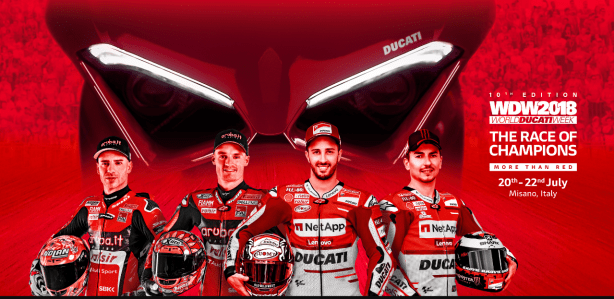 Un concentrato di eventi, feste, parata in moto, spettacoli, concerti e gare in pista con i piloti Ducati MotoGP e Superbike di oggi e di ieri. Un mix perfetto di divertimento, senso di appartenenza alla community, il mondo racing e, su tutto, la forza coinvolgente ed aggregante del marchio: il WDW2018 è pronto a dare spettacolo!