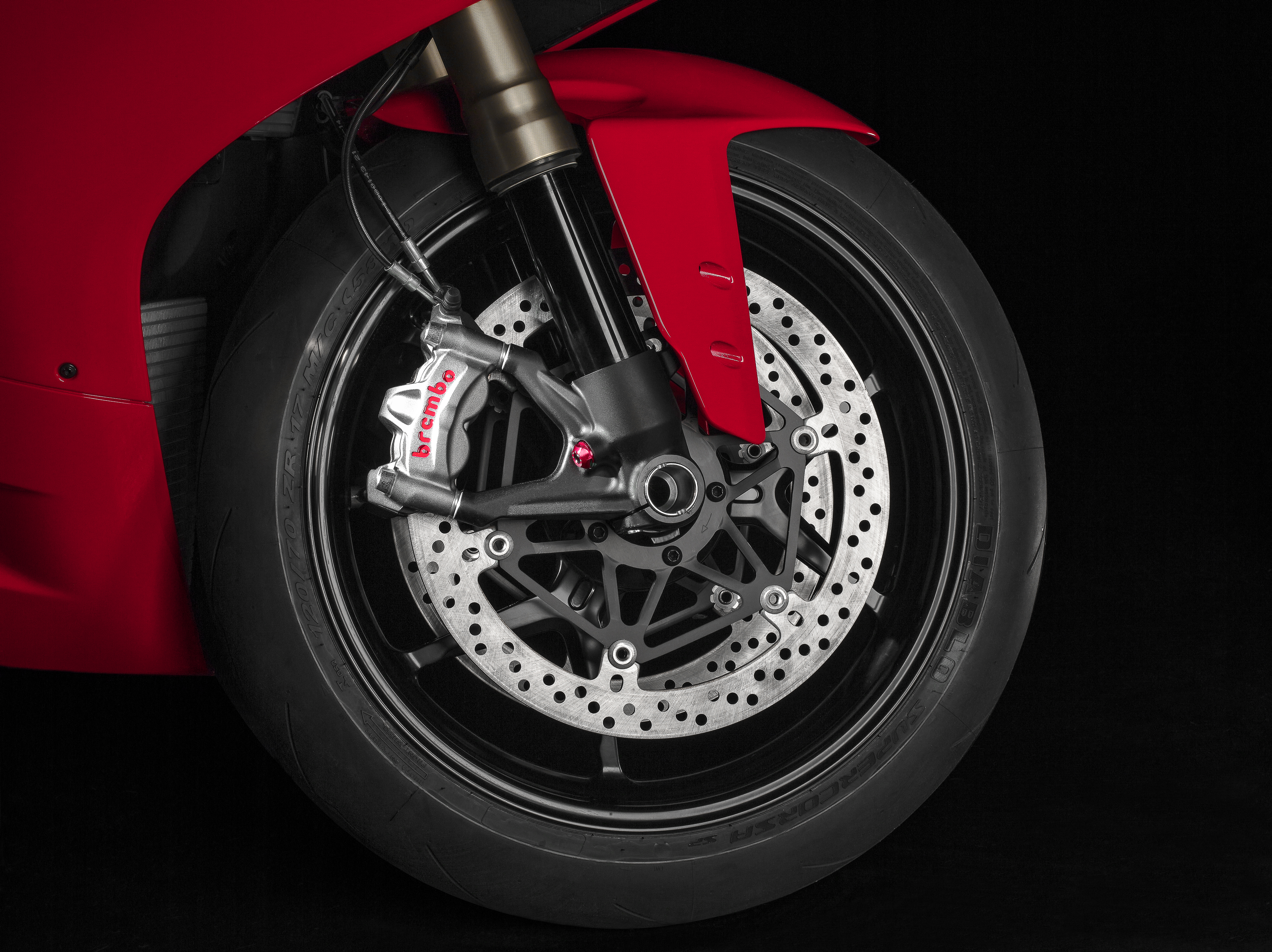 Tutta la famiglia 1299 Panigale/Panigale R è equipaggiata con le pinze monoblocco Brembo M50 che oltre ad essere caratterizzate da un design compatto, consentono un importante risparmio di peso. Le pinze, lavorate da un singolo blocco in lega, offrono maggiore rigidità e resistenza alla deformazione nelle frenate più estreme. L’incremento del rendimento idraulico che ne deriva non soltanto assicura un’efficienza frenante spettacolare ma migliora anche la precisione e la ensibilità alla leva del freno. Le doppie pinze Monoblocco Brembo hanno ciascuna quattro pistoncini da 30 mm di diametro che lavorano su dischi da 330 mm di diametro garantendo un’eccezionale efficienza frenante. Tutte la famiglia 1299 Panigale/Panigale R è poi equipaggiata col nuovo sistema di ABS Cornering, che sfrutta la leggerissima centralina 9.1MP della Bosch.