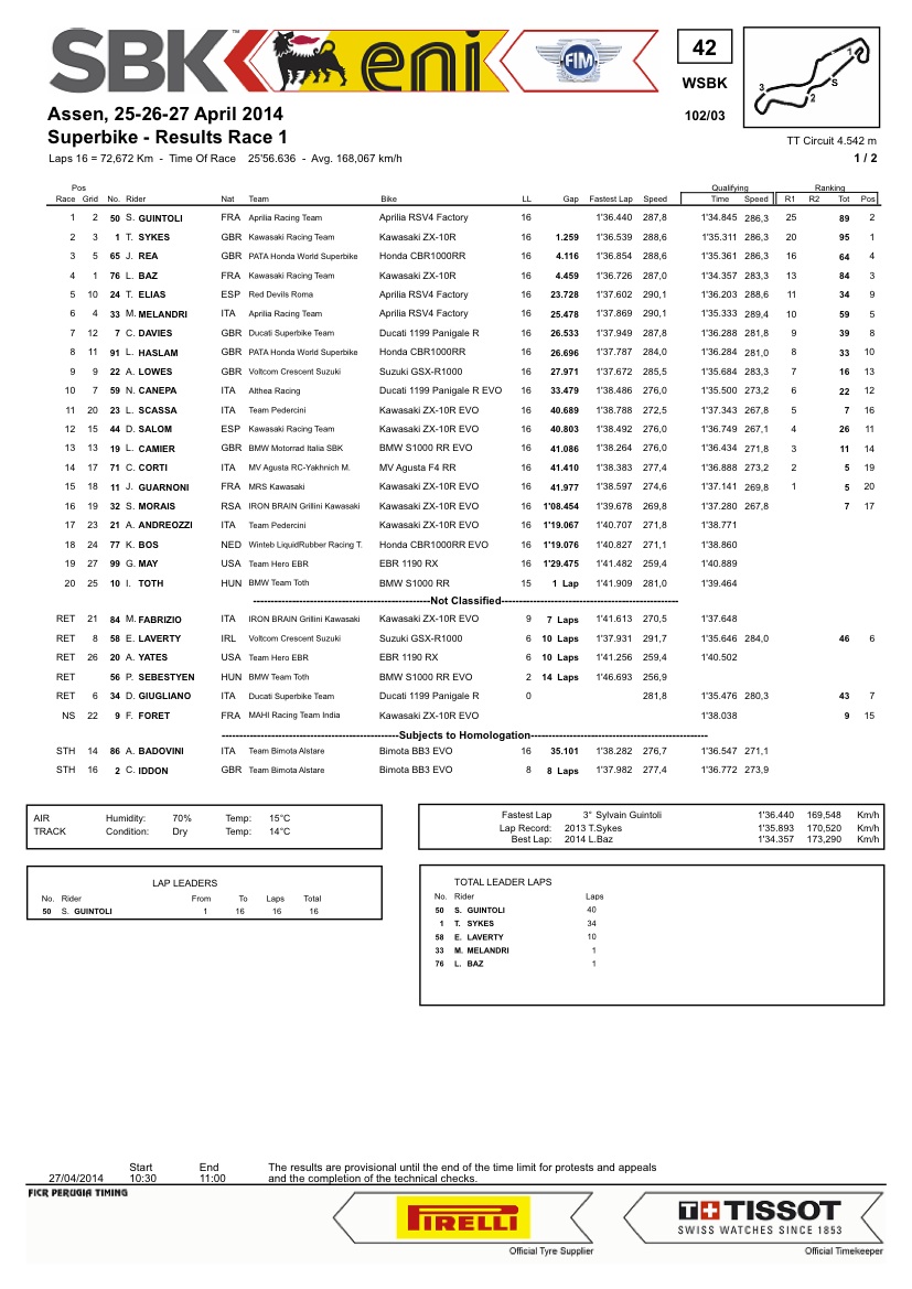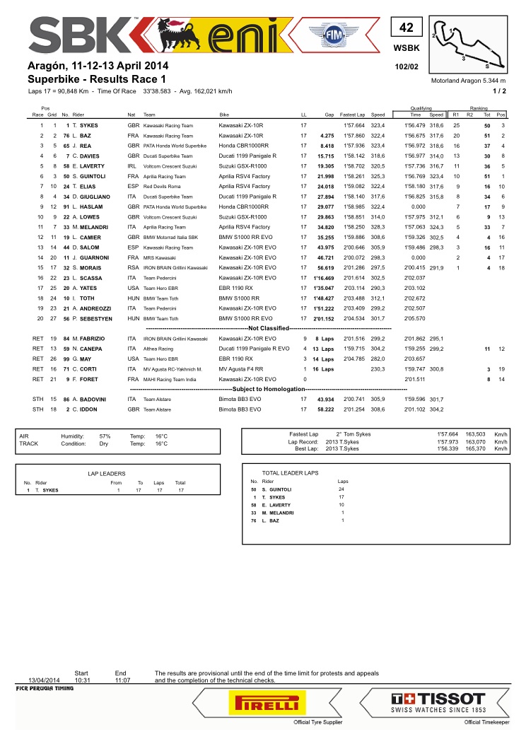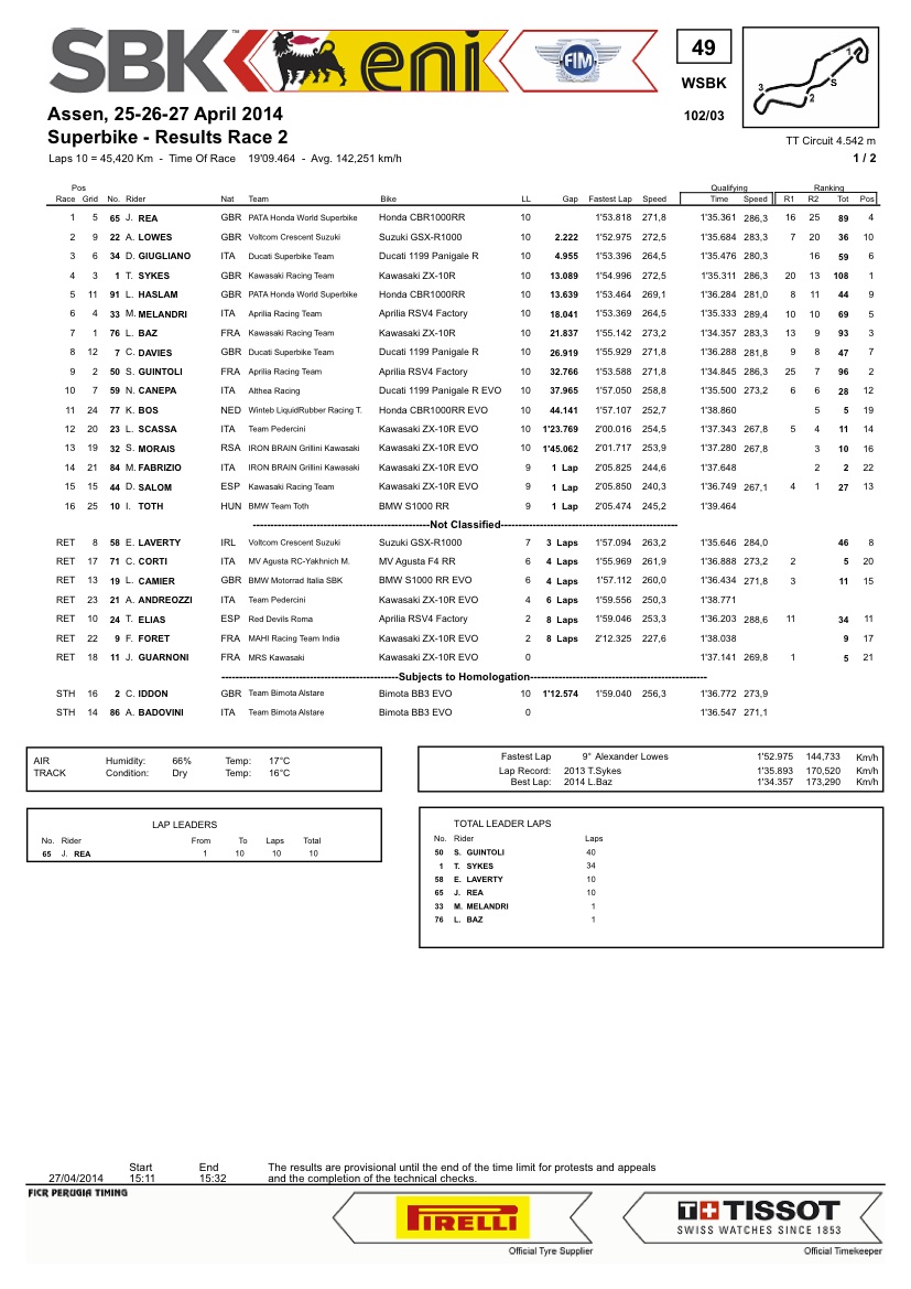 10 1 S. GUINTOLI FRA PATA Honda World Superbike Team Honda CBR1000RR SP 1’49.296 1.952 0.095 12 162,582 278,5