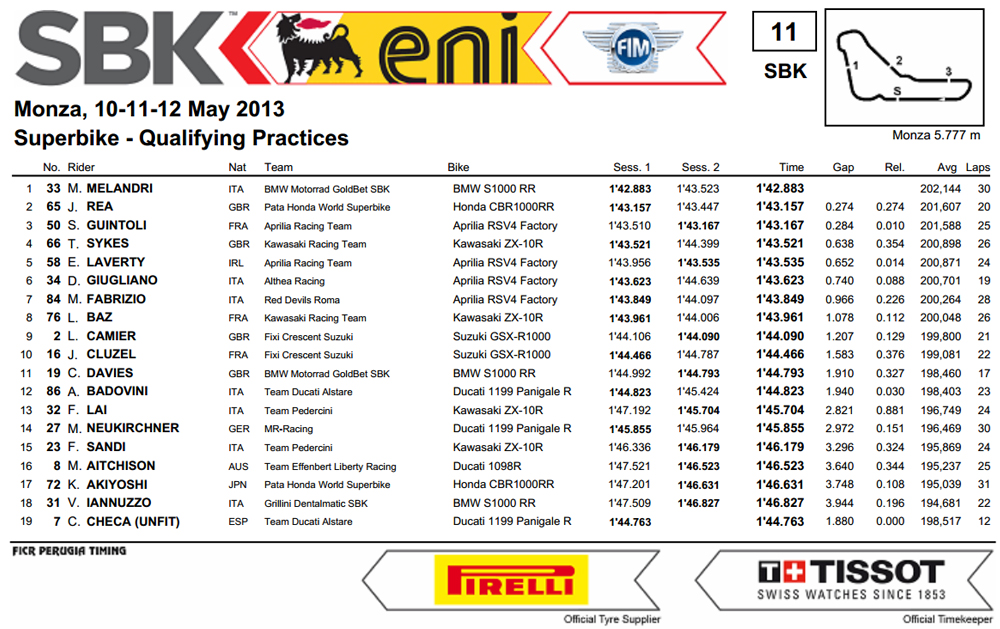 Autodromo Nazionale Monza, Classifica Combinata Qualifiche