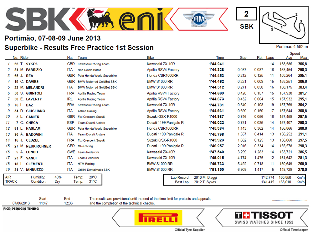 Autódromo Internacional do Algarve Portimão, Classifica Prove Libere 1