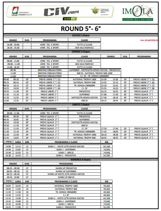 Doppio round di gare al sabato e alla domenica per le classi Moto3, Superbike, SS e PreMoto3. Gare alla domenica per la Sportproduction, trofei National e E&E Honda.